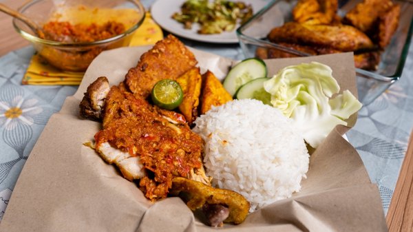 - 1Hidangkan bersama nasi putih, ayam gepuk, sedikit sambal diatas ayam bersama tauhu tempe, limau kasturi, timun dan sayur kobis