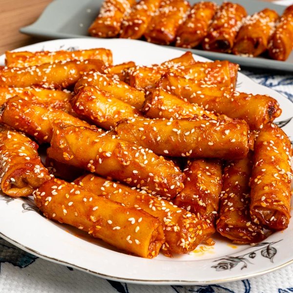 - 5Tutup api dan masukkan popia goreng. Gaul sehingga popia bersalut sebati dengan kuah sira.
